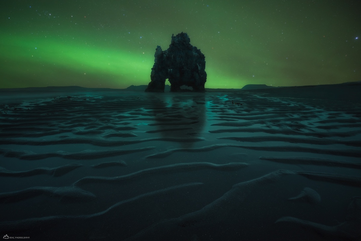 寒夜犀牛 寒风呼啸,欧若拉飞舞,海滩上冻僵的犀牛。